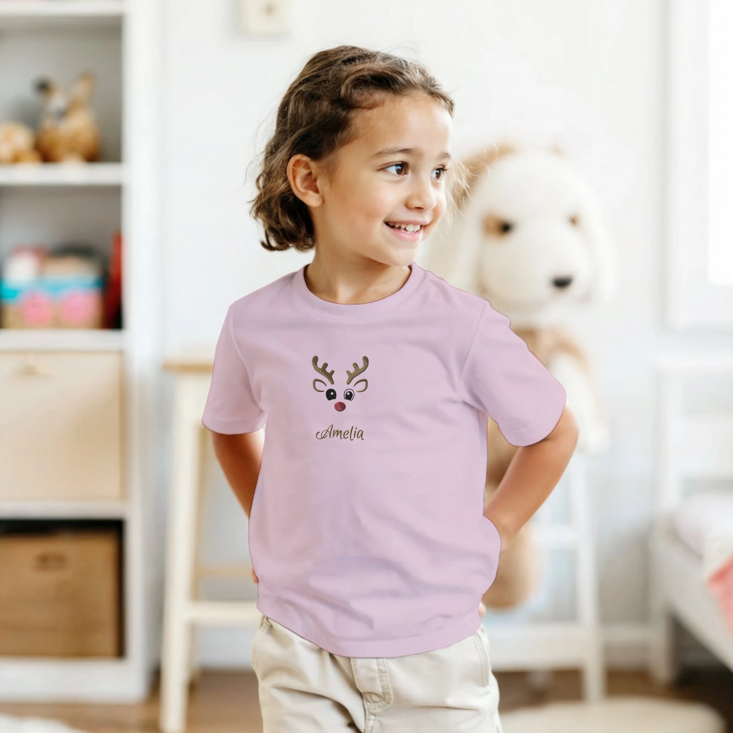 Kids Reindeer & Name - Embroidered T-shirt